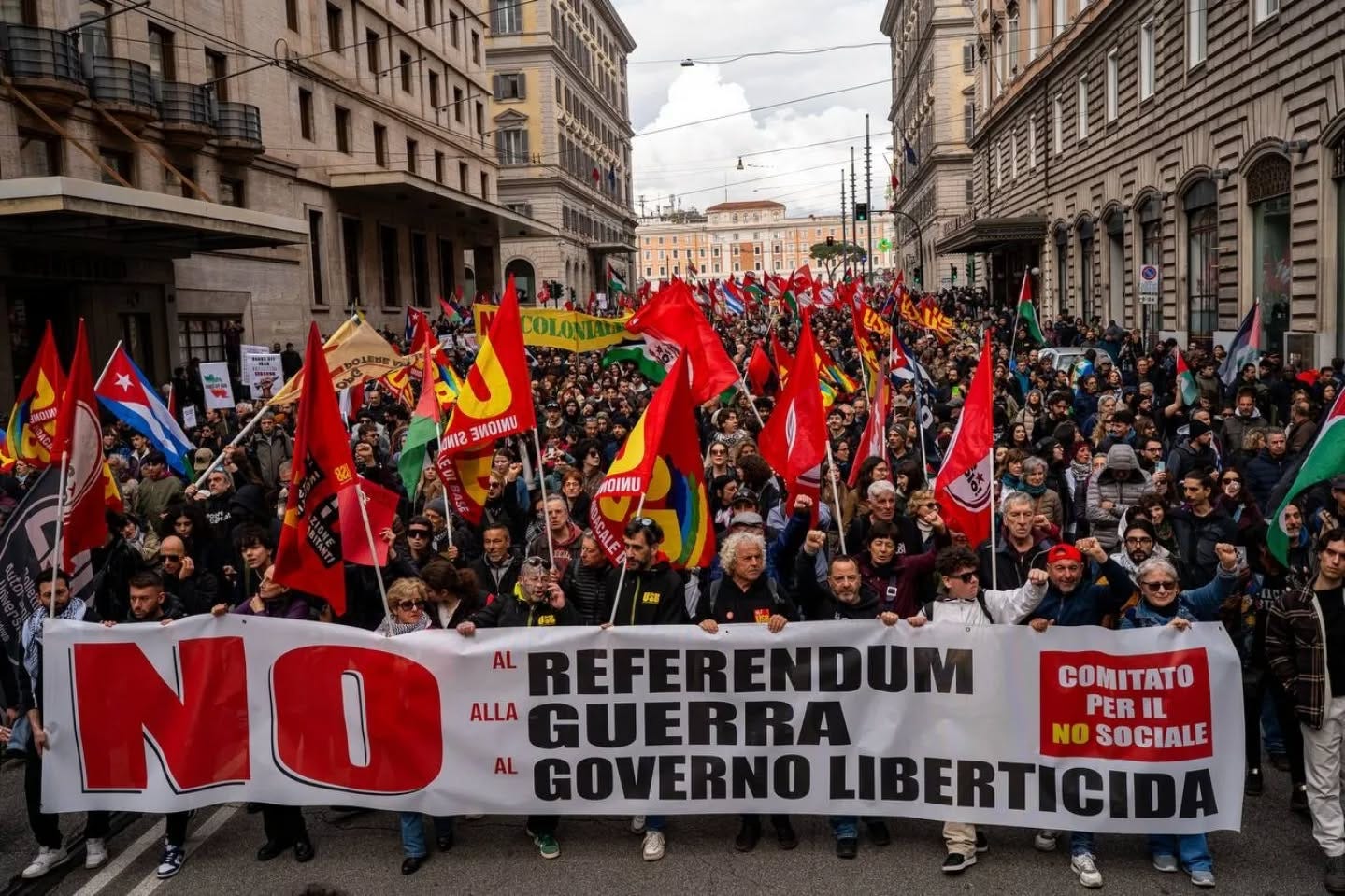 On 14 March, protesters also assembled to denounce the government’s militarization drive and their endorsement of illegal US-Israeli attacks on Iran and the genocide in Gaza. The mobilization thus sent a resounding no to Meloni’s overall agenda, the left party Potere al Popolo emphasized. “‘NO’ to institutional rollbacks, starting with the referendum on 22–23 March, through which the Meloni government is quietly tightening its authoritarian grip on democracy,” they said shortly after the event. “‘NO’ to the social war that the government wages every day against working people, against the homeless, and against those who can’t make ends meet.”