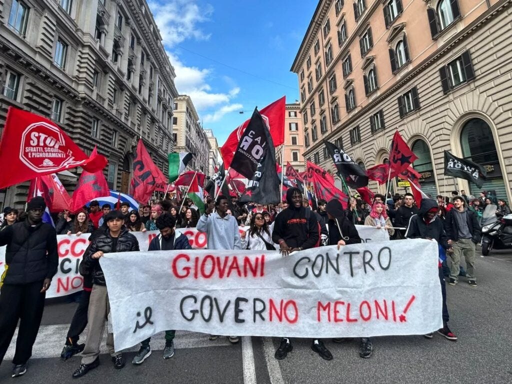 The student organizations Cambiare Rotta and OSA highlighted the diversity of Saturday’s demonstration, seeing in it the best response to right-wing trends in Italy. “So many causes are driving this march,” they wrote on the day, “from supporting socialist Cuba … to campaigning for the more than 160 Iranian girls killed by imperialism, to efforts led by young people from working-class neighborhoods and squatter communities.”